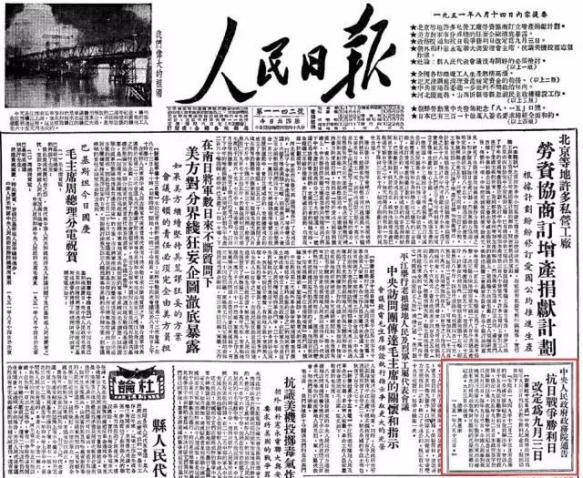 為了紀念這來之不易的勝利,1949年底,中華人民共和國政務院曾將8月15日作為抗戰勝利紀念日。1951年8月13日,政務院發布了通告,將“抗戰勝利紀念日”定在了每年的9月3日。